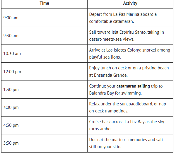 Within the first few hours of arriving, you’ll hear about a catamaran La Paz experience. It could be a day trip to Espíritu Santo Island, a sunset cruise along La Paz Bay, or a snorkeling tour through the biodiverse reefs. Each option lets you discover why catamaran sailing here has become a must-do for travelers seeking both serenity and exploration.