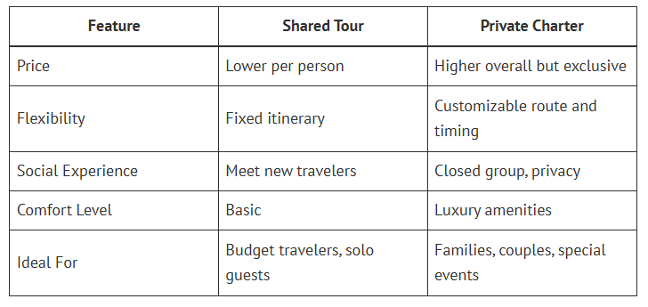 Shared tours are more social and affordable, while private charters offer space, privacy, and personalized service.