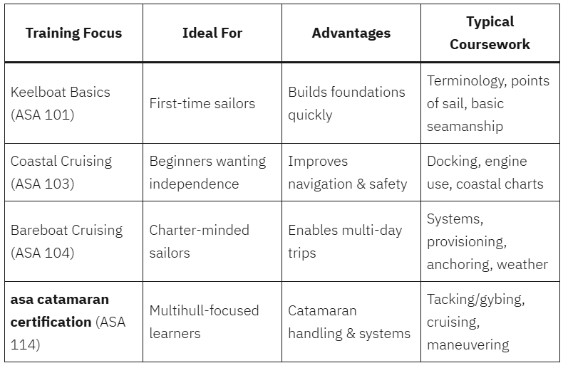 If you’re learning, many visitors seek structured training such as asa catamaran certification, which helps build multilayered competence around navigation, seamanship, systems, and multihull handling.